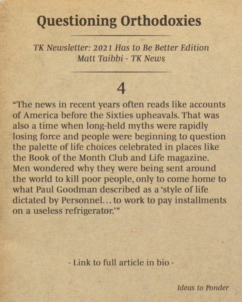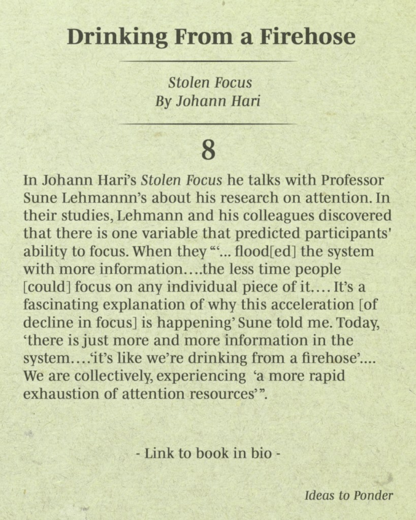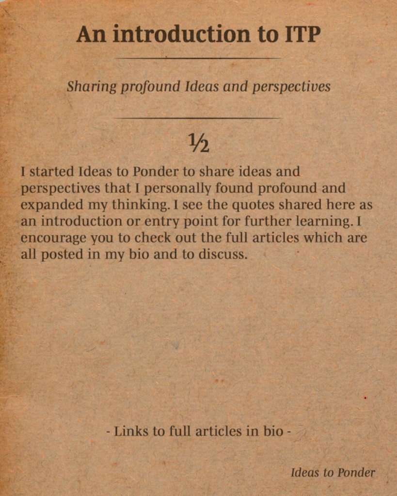 Ideas To Ponder is an Instagram account I created to share interesting/important ideas and perspectives. The quotes come from various articles, books, videos, and podcasts. Here you can find links to the original sources.